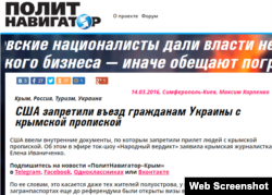 Упомянутые сайты сообщили, что США ввели так называемые внутренние документы, по которым въезд на территорию Соединенных Штатов людям, которые имеют крымскую прописку, запрещен. Такой вывод сделали из комментария журналистки «1-го Российского канала» в Крыму Елены Иваниченко. В эфире программы «Народный вердикт» телерадиокомпании «ИТВ» от 11 марта 2016 года она сообщила: