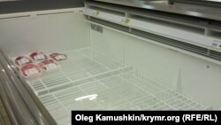 Как сообщает корреспондент Крым.Реалии, больше всего бросается в глаза нехватка мясных продуктов. Холодильники с мясом стоят полупустые, а свинину в магазин вообще не завезли.
