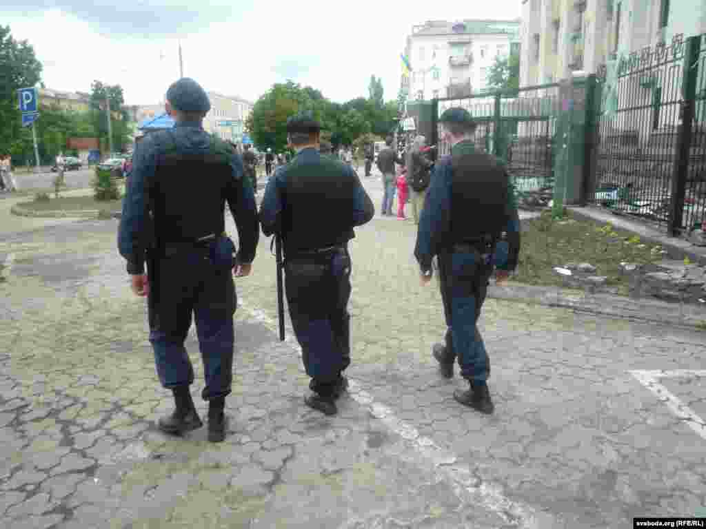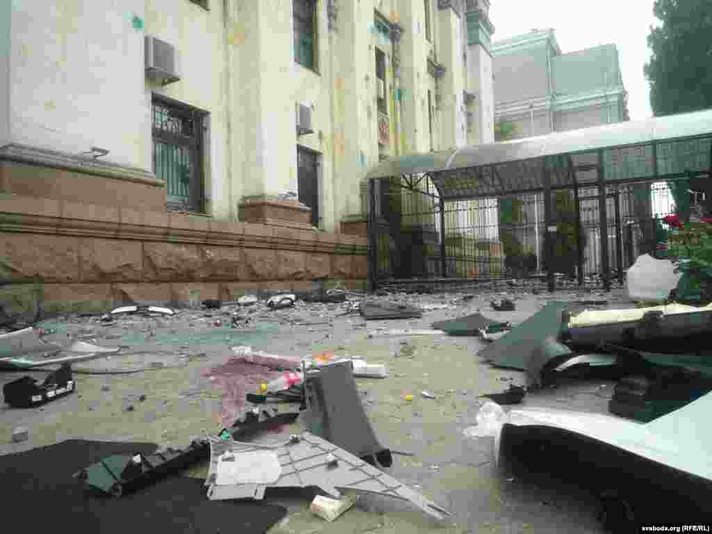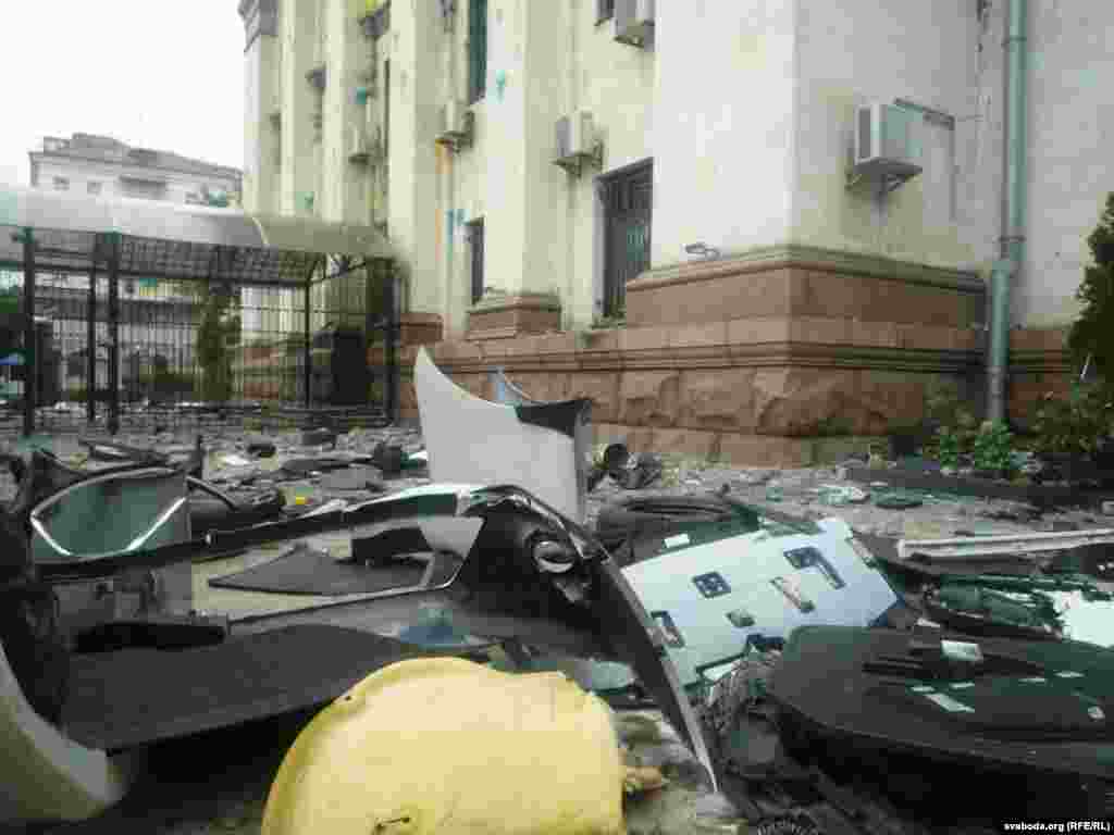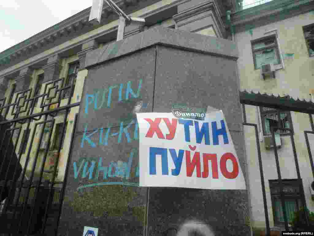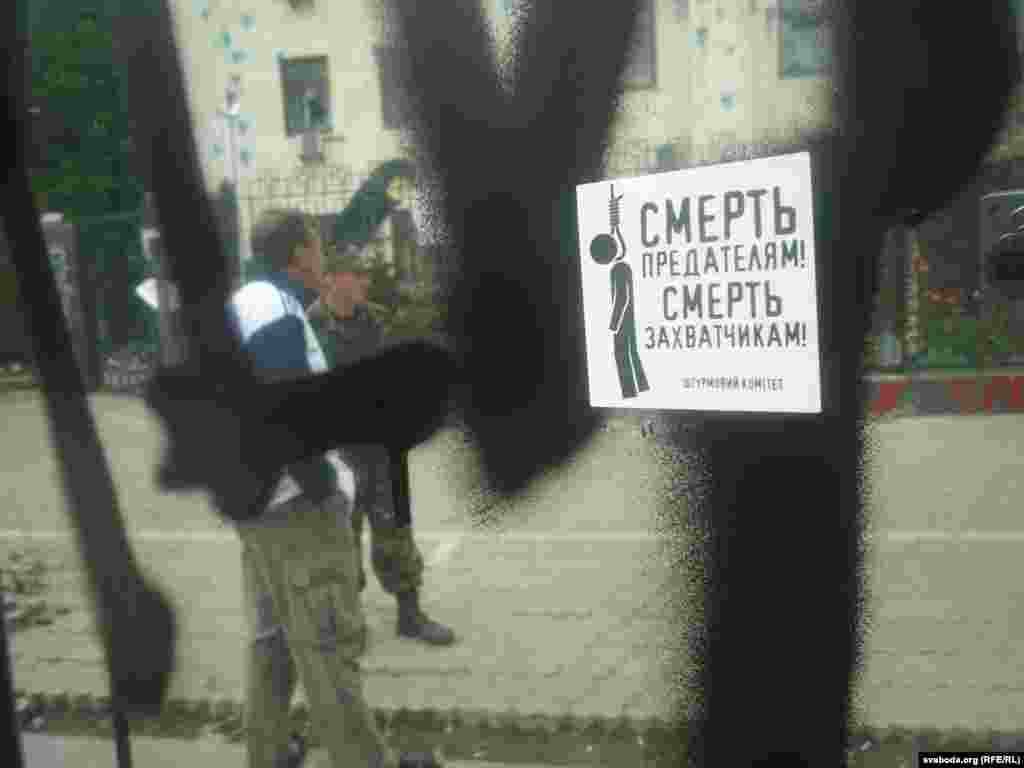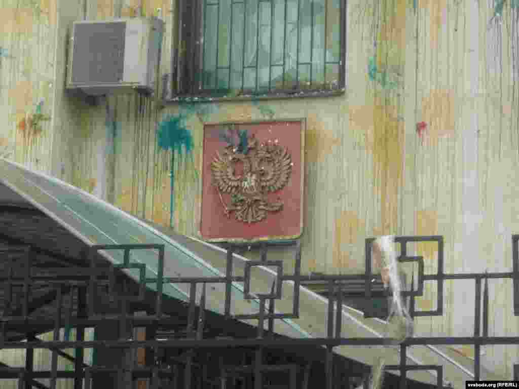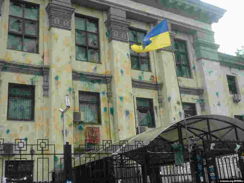 Около российского посольства в Киеве спокойно, порядок контролируют представители милиции и государственной охраны дипломатических представительств. Много прохожих останавливается, чтобы посмотреть на результаты акции протеста, время от времени следуют споры, но до силового противостояния не доходит. На здании рядом с посольством жители вывесили флаги Украины и Евросоюза. Фото Павло Зубьюк.