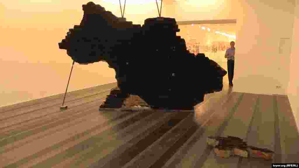 В Киеве в PinchukArtCentre проходит выставка «Страх и надежда». Среди всех работ, представленных на выставке, наибольший резонанс вызвала инсталляция Кадыровой, которая представляет собой каменную карту Украины, от которой отколот Крым.