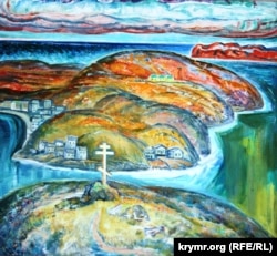 Так крымский союз художников отработал «скрепу» «патриотизма». Привычно для устроителей выставки и вторая часть этой пары – «скрепа» «православие». К этой теме относятся триптих «Поклон Православию», цикл «Храмы в Крыму и в России». Организаторы подчеркивают, что Иван Копаенко ее «вдохновенно разрабатывает», и что «они пронизаны жизнеутверждающим началом». Тем не менее, в зале, где экспонируется выставка, как можно заметить на фотографиях, пусто. Больше чем за час, кроме меня, туда зашел еще только один посетитель. Видимо, такие картины Ивана Копаенко не являются для крымчан открытием.