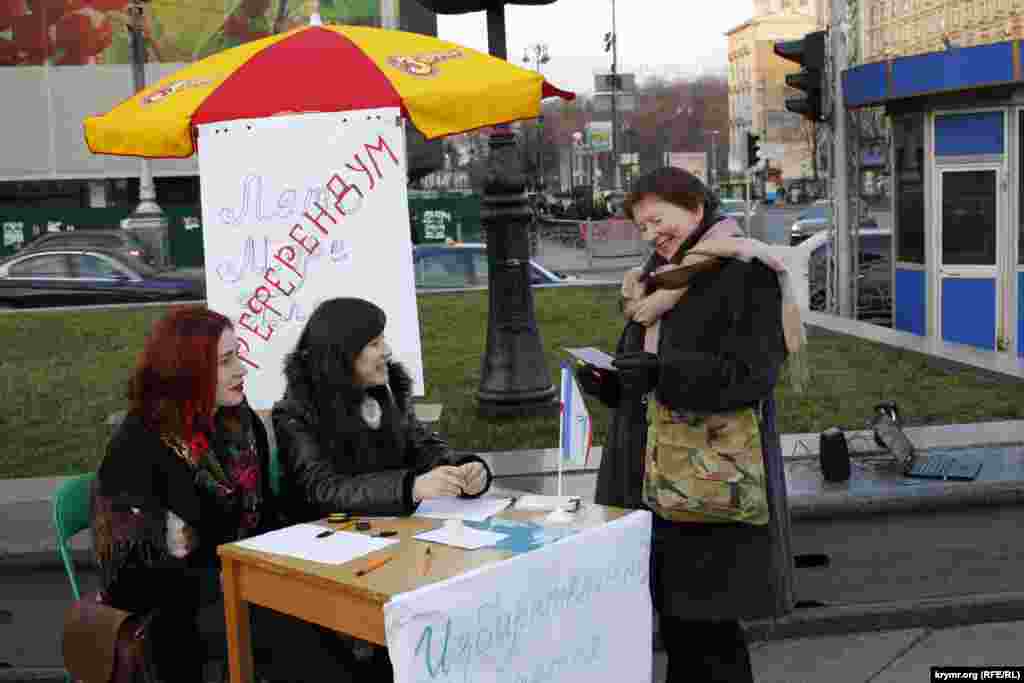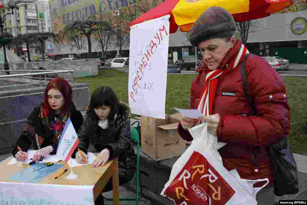 За день до годовщины крымского «референдума», активисты центра гражданского просвещения «Альменда» провели в центре столицы флешмоб под названим «Лето. Море. Пляж. Референдум».