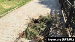 На улице Толстого вдоль набережной Салгира похожая картина. На участке в полтора квадратных метра провалилась плитка. Отличие лишь в том, что это зона для пешеходов.