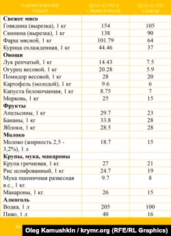 Привести абсолютно объективную сравнительную статистику по ценам на продукты питания, к сожалению, не представляется возможным, однако сделать выводы об их порядке можно на основании открытых источников. В качества источника информации по крымским продуктовым ценам можно использовать информацию Крымстата (она достаточно репрезентативная) за июнь. На сайте киевского управления статистики мы не нашли подобной информации, поэтому за основу возьмем усредненный уровень по нескольким супермаркетам (Сильпо, Фуршет, Новус, Ашан). В таблице указаны лишь некоторые основные продукты питания.