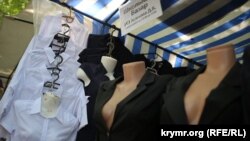 Родители, которым «посчастливилось» снаряжать детей в школу в российском Крыму, ходят от одного киоска к другому – прицениваются. Женщина с длинным списком необходимого записывает цены на каждую позицию. Кроме канцтоваров, формы и ранца в перечне – банты, гольфы, колготки.