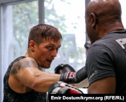 В это время Александр Усик разминается перед рингом: сначала он делает растяжку, затем висит на турнике. Несколько молодых людей, пользуясь случаем, просят крымчанина сфотографироваться с ними. Открытые тренировки Усика перед ответственным поединком уже стали доброй традицией.