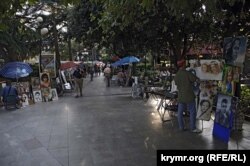А это – знаменитый рынок художников на Пушкинской. Здесь круглый год местные и приезжие художники продают картины. Ну, и заодно, все красивое, что делается руками – керамику, набивные ткани, украшения из дерева, литье, ковку – в общем, все. Очень хорошая и добрая традиция, одна из немногих, позволяющая крымчанам почувствовать, что все-таки до Европы отсюда ближе, чем до Сибири или Китая.