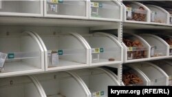 Опустошенные полки с дешевым печеньем. 60 рублей – э о 19 гривен. В других магазинах печенье как минимум вдвое дороже.