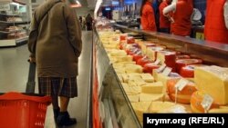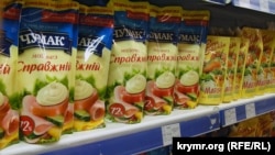 Эволюция крымской действительности более наглядно. Слева сыр «Российский» украинский, справа – «Российский» российский, то есть «Молочная долина» – это украинский бренд, «Добряна», соответственно, российский. Стоимость украинского сыра – 348 рублей за килограмм (125 гривен), российского – 579 рублей килограмм (208 гривен). За качество украинского ручаюсь, российский, если честно, не пробовал. Пока есть в продаже украинский сыр, на российский меня почему-то не тянет.