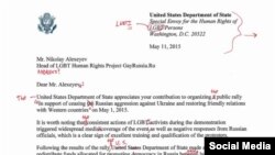 Разочаровавшись в оппозиции, Госдеп США при продвижении своих интересов в России переориентировался на защитников секс-меньшинства. В распоряжении «Известий» оказался ряд документов, в том числе переписка активистов Федерации ЛГБТ-спорта России, о возможном зарубежном финансировании российских Открытых ЛГБТ-игр. Ранее в Сети появилась переписка российского активиста ЛГБТ-движения Николая Алексеева с представителями Госдепартамента США, которые отметили его вклад в организацию митинга «в поддержку прекращения российской агрессии против Украины и за восстановление дружеских отношений с западными странами 1 мая 2015 года».