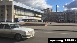Ближе к 12 часам, когда должна была начаться трансляция из Москвы, мастера включили телеканал «Первый крымский» (в прошлом – ГТРК «Крым»). На площади стали собираться люди, однако их было не более двух-трех десятков, в том числе сотрудники правоохранительных органов. Одни стояли в нескольких метрах от экрана, другие решили присесть у подножия памятника Ленину напротив.