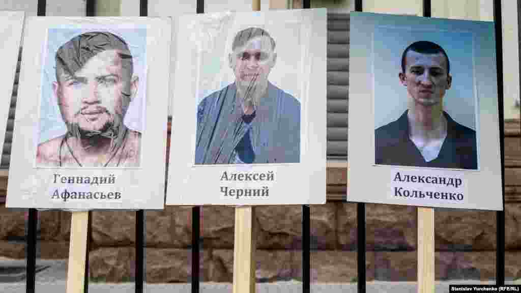 У забора российского посольства были выложены портреты крымчан, которые находятся в тюрьмах на территории аннексированного Россией Крыма, а также пропавших без вести крымчане.