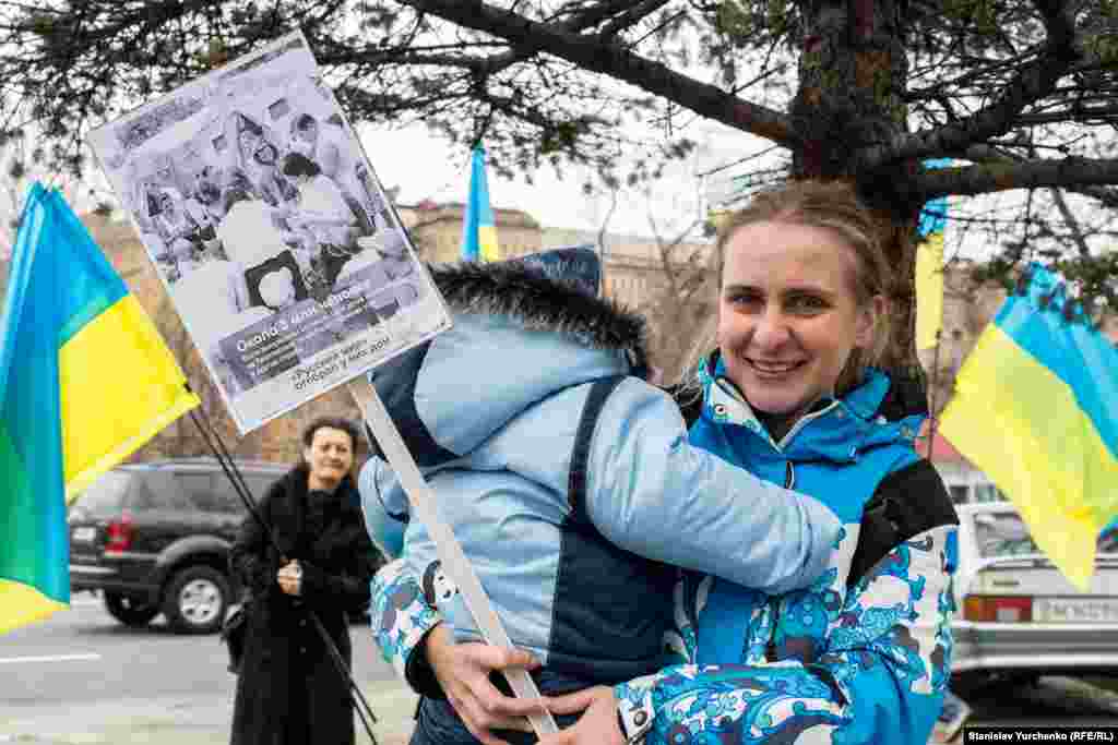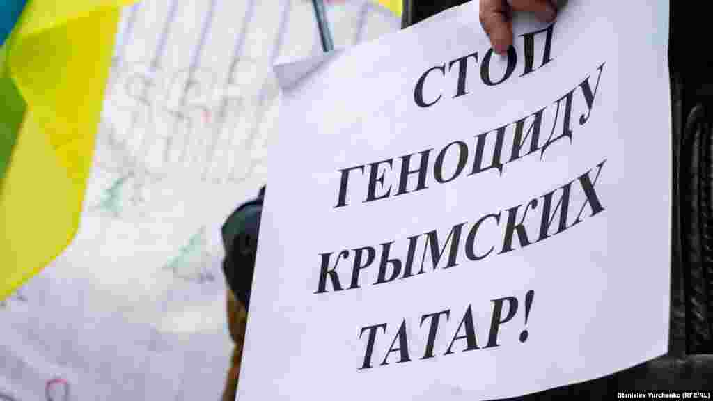 В руках у собравшихся плакаты с надписями: «Стоп геноциду крымских татар», «Нет репрессиям, обыскам, арестам», «Поява політв’язнів – крок у радянське минуле» и другие.