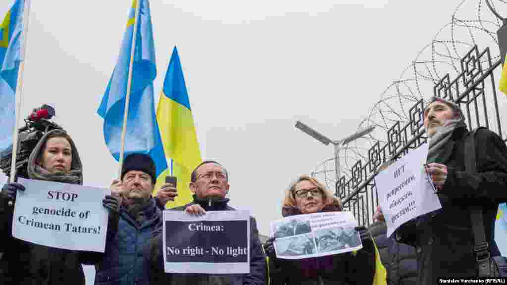 У посольства Российской Федерации в Киеве 10 декабря прошел митинг к международному Дню защиты прав человека. В мероприятии приняли участие несколько десятков человек, среди них члены Меджлиса крымскотатарского народа, правозащитники, переселенцы из Крыма и Донбасса. Активисты требовали прекратить нарушения прав человека в Крыму.