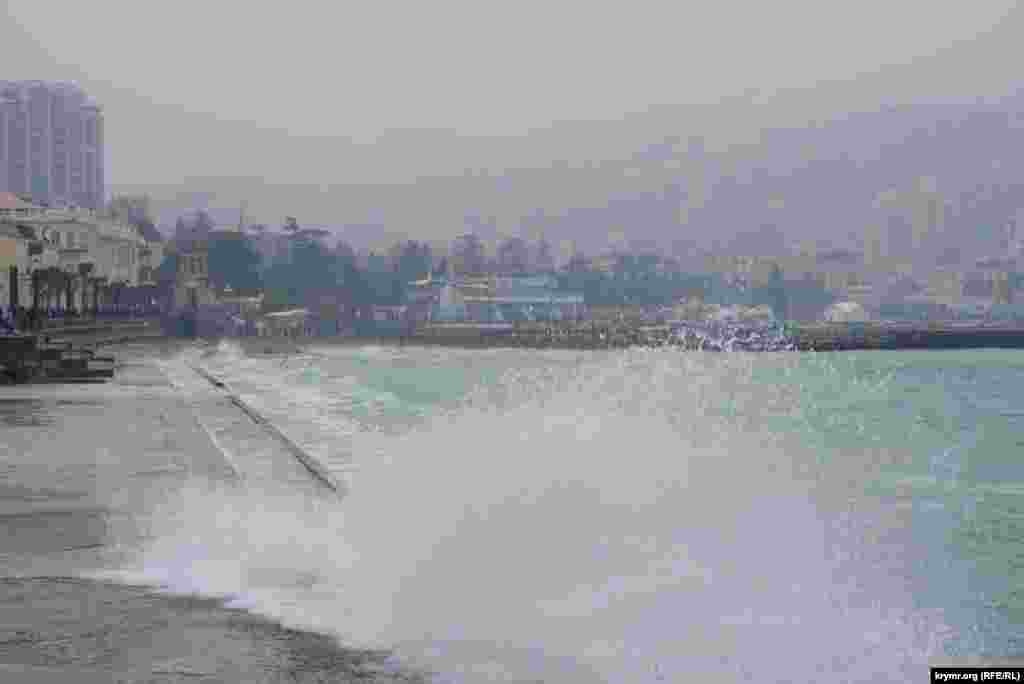 5 января в Ялте действительно штормило, был зрелищный прибой. Волны неистово налетали на бетонные волнорезы, опорные стенки и шумно разбивались, обрызгивая беспечных прохожих