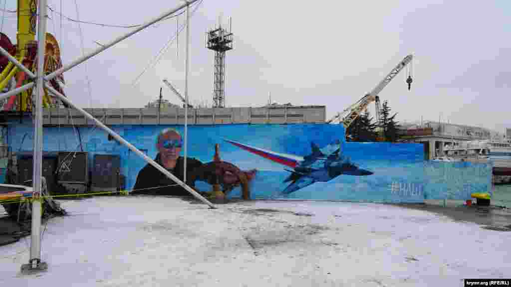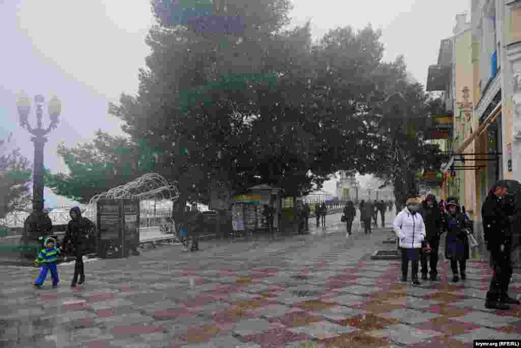 Сами приготовления к Рождеству в Ялте были заметны только близ  центральной набережной, где традиционно и проходят все торжества. Несмотря на обильный мокрый снегопад при температуре +3, рабочие возле главной новогодней собирали деревянные павильоны для аттракционов и деревянные домики