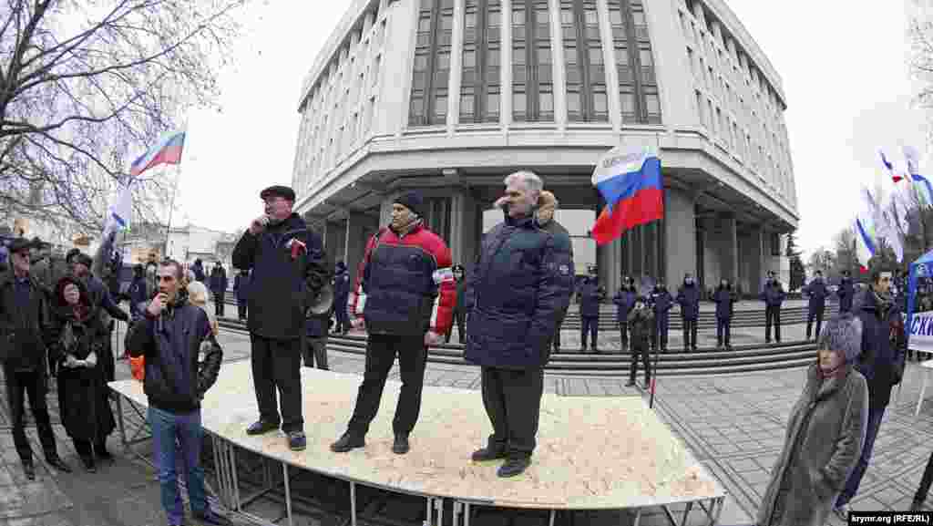 Митинг человек в пятьсот у Верховной Рады Автономной республики Крым стал деталью пейзажа, так как идет с утра и до вечера. Этот фоторепортаж не может служить полной картиной происшедшего, но он показывает, как выглядели события в самом центре вихря, накрывшего Крым в феврале 2014.