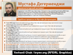 В каких именно деяниях подозревают последнего – непонятно. Его адвокат Александр Солодков является наименее публичным из всех защитников фигурантов «дела 26 февраля» и отказывается от общения с журналистами. Известно только, что Дегерменджи инкриминируют участие в массовых беспорядках, организованных Меджлисом.