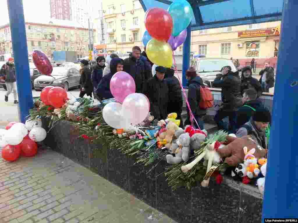 У станции метро "Октябрьское поле", где была задержана няня, убившая 4-летнюю девочку, возник стихийный мемориал, люди приносят цветы, игрушки и воздушные шарики