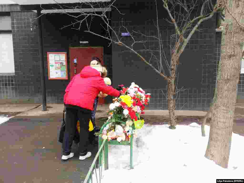 К подъезду дома люди несут цветы, свечи, сладости и игрушки