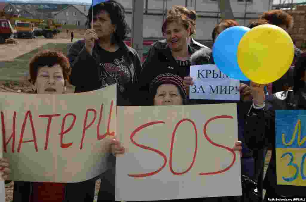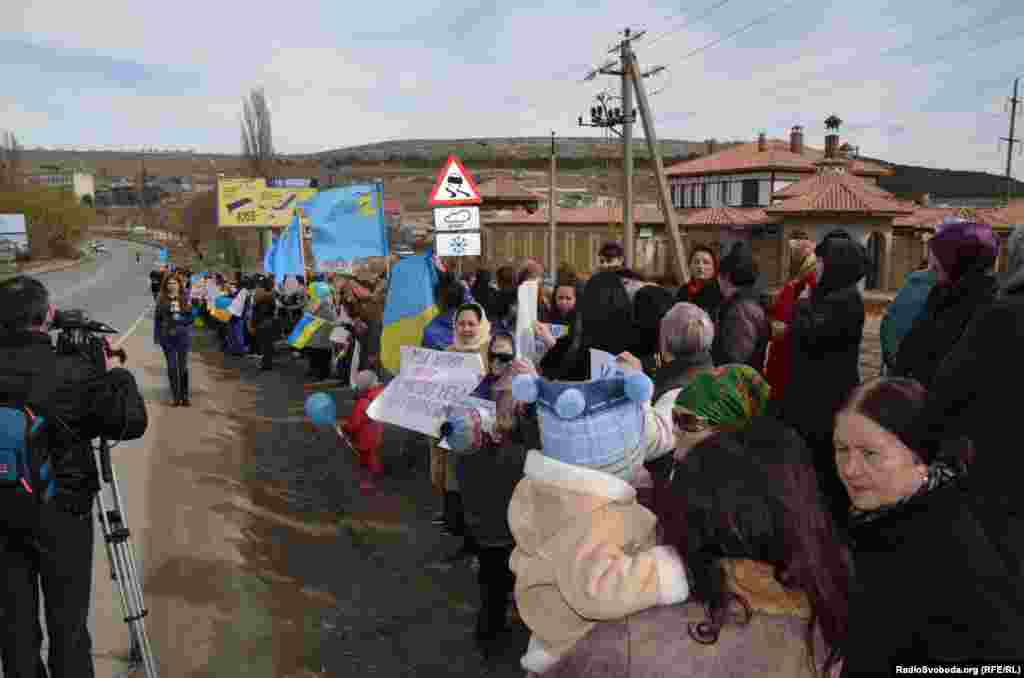 Ко второй годовщине российской аннексии украинского полуострова Крым.Реалии публикуют архивные фото, на которых видно, как в 2014 году проходила оккупация Крыма и как его жители ей сопротивлялись. Несколько сотен женщин с крымскотатарского массива Строгановка на окраине Симферополя в четверг, 6 марта, провели акцию за мир и против пребывания российских войск в Крыму. Они выстроились вдоль Объездной дороги с украинскими и российскими флагами, желтыми и голубыми воздушными шариками. Многие автомобили, которые проезжали по трассе, сигналили в поддержку акции.