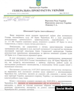 В письме подчеркивается, что в ведомстве расследуют уголовное производство по факту совершения судьями крымских судов государственной измены, и в ходе досудебного расследования установили, что 24 марта 2014 года Чернобук «во время интервью высказывался по вопросу перехода работы судей на применение российского законодательства, в дальнейшем читал судьям лекции по соответствующей тематике».