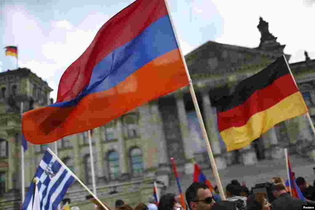 Люди с флагами Армении поддерживают принятие резолюции, перед зданием Бундестага