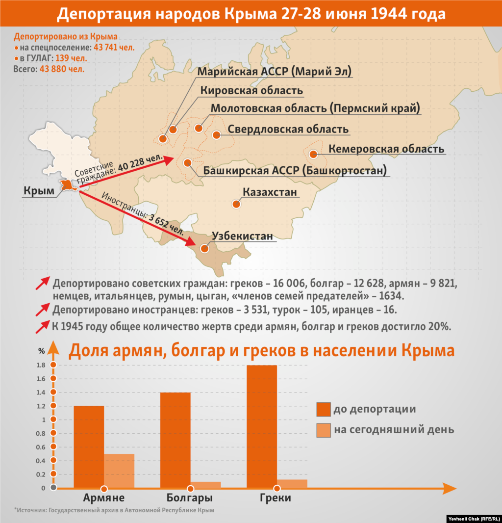 Изгоняя в мае 1944 года крымских татар с их родины, коммунистический тоталитарный режим хотя бы пытался придать видимость законности своим действиям. Обоснование новым депортациям правящий режим во главе с Иофисом Сталиным даже не потрудился подыскать. «Целесообразно выселить» – значит, выселить. Крым.Реалии собрали данные о депортации армян, болгар и греков с территории полуострова в июне 1944 года.
