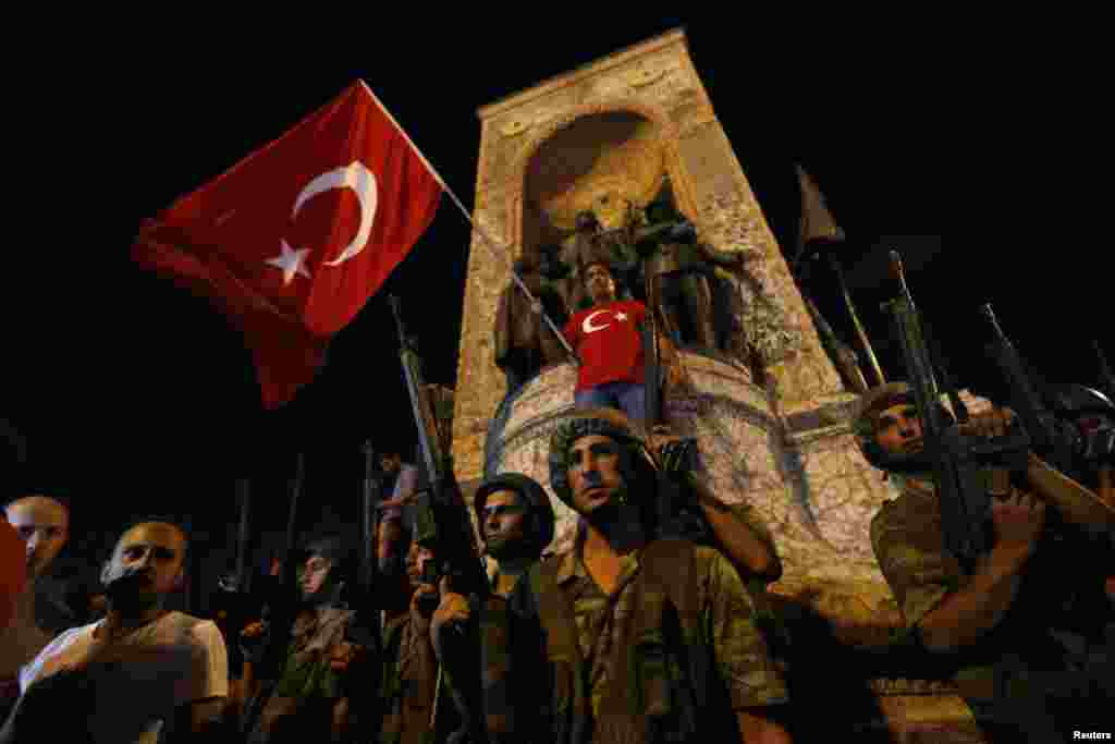 Turkey -- People react towards a Turkish solder at Taksim square in Istanbul on July 16, 2016.