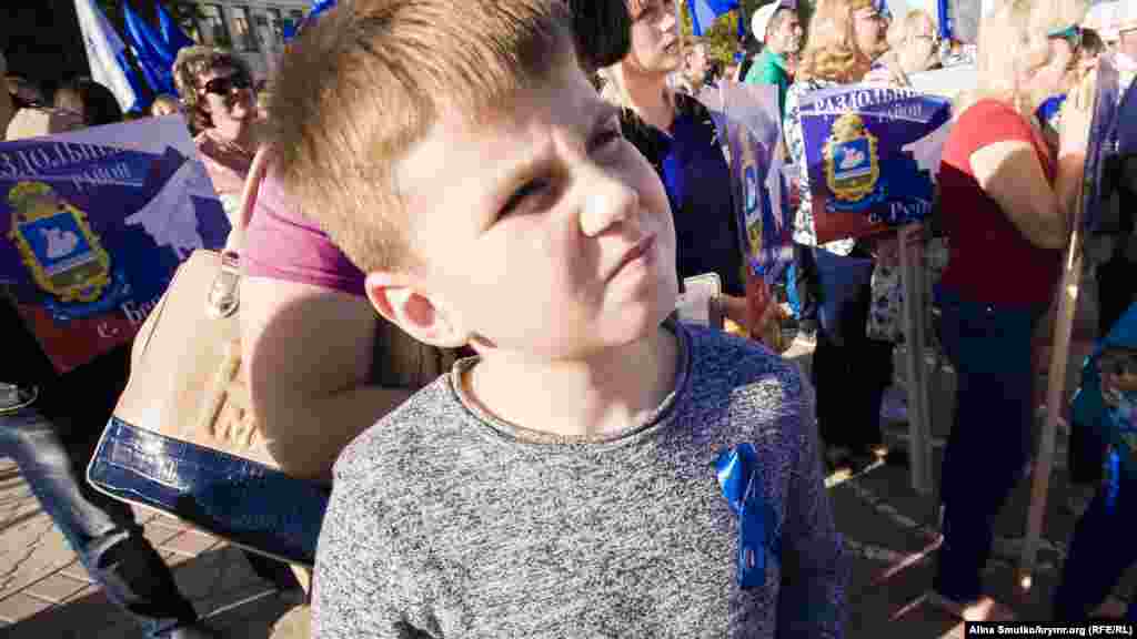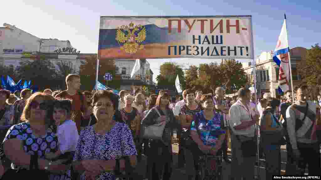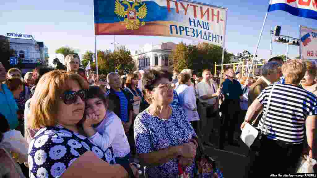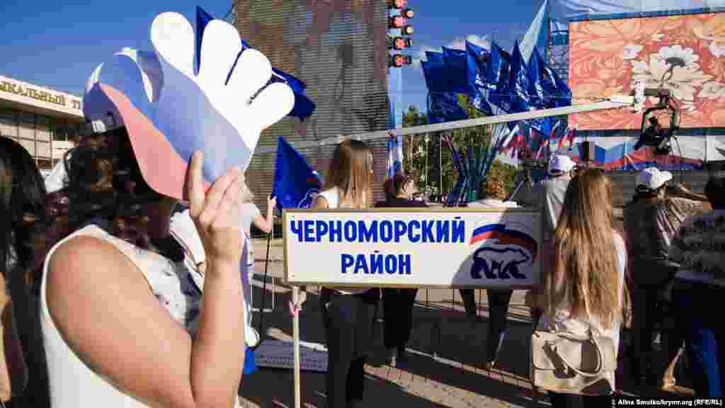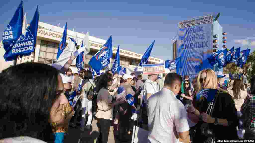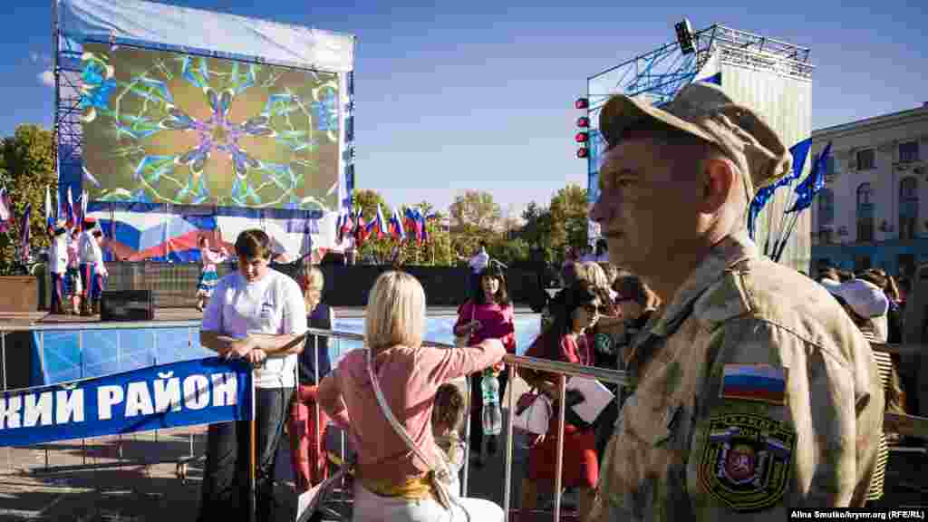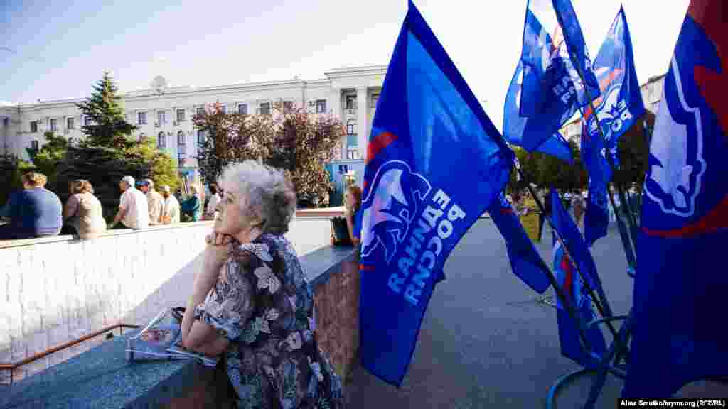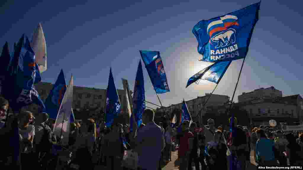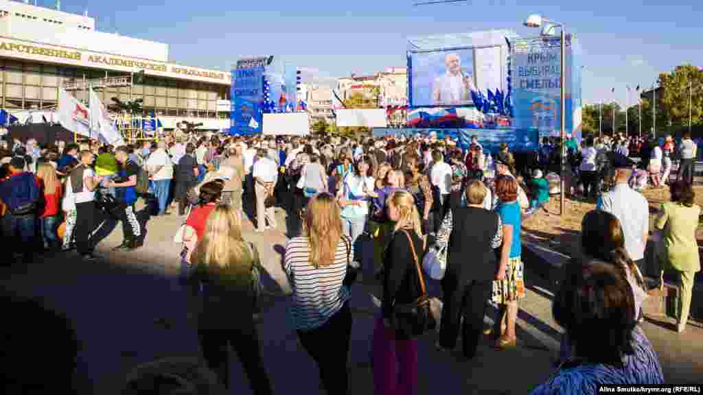 В предверии выборов в Государственную Думу России на территории Крыма, которые Украина признала нелигитимными, на площади Ленина в Симферополе проводят концерт под флагами партии «Единая Россия». На подходе к сцене стоят рамки металлоискателей, территория проведения концерта оцеплена, прилегающие к площади улицы перекрыты.