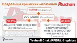 ООО «Ашан», по данным Единого госреестра юрлиц России, напрямую владеет французское АО «Сожепар» (99,99% акций) и ЧАОО «Меелаер Б. В» из Нидерландов.