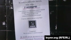 Севастопольские коммунисты 5 ноября расклеили в городе листовки с призывом прийти на митинг и демонстрацию в честь 99-й годовщины Октябрьской революции. Об этом сообщает корреспондент Крым.Реалии.
