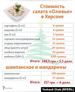 Новогодний стол ежегодно становится одним из показателей ценовой ситуации в стране. Крым.Реалии подсчитали, во сколько жителям аннексированного Крыма и материковой Украины обойдутся приготовления к предстоящим праздникам на примере традиционного новогоднего блюда – салата «Оливье».