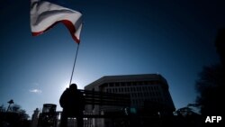 Утром спикер крымского парламента Владимир Константинов вернулся из Москвы. Внеочередную сессию Верховной Рады Крыма назначили на 12 часов. Журналистов внутрь не пропускали.