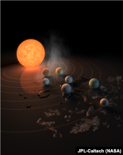 Если планеты системы TRAPPIST-1 по своим геометрическим параметрам похожи на нашу, то звезда, вокруг которой они обращаются, мало напоминает Солнце. Это "красный карлик", масса которого – около 8 процентов от массы Солнца, светимость – почти в 2 тысячи раз меньше светимости Солнца, а по радиусу он больше напоминает Юпитер. Орбиты планет расположены очень близко к маленькому светилу, их периоды обращения, то есть продолжительность местного “года”, составляют от двух до нескольких десятков суток. Близки орбиты и друг к другу: авторы исследования отметили в ходе пресс-конференции, что с каждой из открытых планет должен открываться прекрасный вид на другие – примерно, как мы можем наблюдать Луну с Земли.