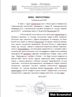 «Представляется, что для подготовки исполнения высокодуховного произведения следует привлечь гениального музыканта Григория Алфеева (митрополита Илариона)! Полагаем, что русская красавица Наталья Поклонская своим пением (с мироточащей иконой государя в руках) покорит сердца жюри, а миллионы телезрителей с радостью и восторгом отдадут свой голос за нашу Няшу!» – говорится в сообщении.