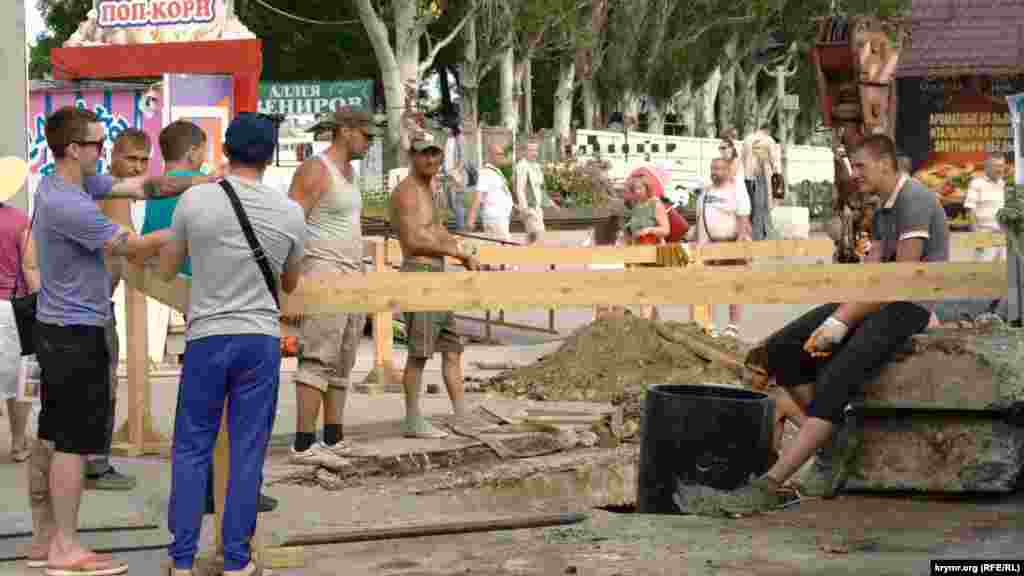 В Феодосии 3 июня продолжаются работы по ремонту канализационного коллектора. Начали их еще в сентябре 2016 года. Ранее директор феодосийского филиала ГУП РК «Вода Крыма» Андрей Чимпоеш сообщил, что до конца июня планируется восстановление асфальтового покрытия на проспекте Ивана Айвазовского. А тем временем художник-маринист пристально следит с пъедестала за живописной картиной, разворачивающейся в самом проходимом месте города. На проект по прокладке коллектора, протяженностью свыше 4 км, выделили 127,5 млн рублей (примерно 58 млн гривен).