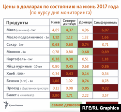 Каждый месяц изменения цен отдельному покупателю отследить не так просто ‒ если не проводить собственный мониторинг, что и сделало Радіо Свобода. Сколько стоят и насколько подорожали хлеб, молоко, яйца, масло, картофель, мясо, сахар, бензин, билеты на проезд и в кино Радіо Свобода мониторило ежемесячно в течение года в Киеве, Северодонецке, оккупированном Донецке и аннексированном Симферополе.