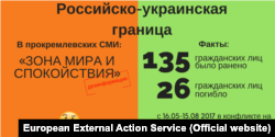 Другой сюжет, противоречащий первому, говорит, что миротворцы не нужны, поскольку граница между Украиной и Россией – «зона мира и спокойствия». Авторы обзора называют это дезинформацией и предлагают посмотреть на количество погибших в вооруженном конфликте в Украине.