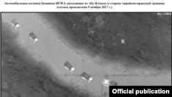 Как утверждали российские военные, опубликованные ими кадры были сделаны 9 ноября 2017 года и на них попала автомобильная колонна боевиков "ИГ", которые двигались из города Абу-Кемаль в сторону сирийско-иракской границы.
