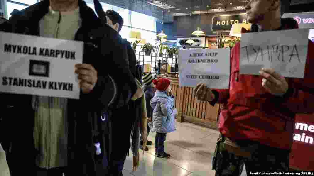 Участники акции собрались в зале киевского аэропорта с именными табличками в ожидании Кольченко