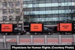 И наконец, последние "три билборда" в нашей подборке: несмотря на то что Россия или ее президент напрямую в них не упоминаются, ни у кого не возникло сомнений, что послание касается и их тоже. Эту акцию устроили у штаб-квартиры ООН в Нью-Йорке активисты правозащитной организации "Врачи за права человека". Она состоялась днем 22 февраля, незадолго до заседания Совета Безопасности ООН, который должен был рассмотреть проект резолюции о перемирии в Сирии, где подконтрольные сирийскому президенту Башару Асаду силы и российская авиация продолжают бомбардировки контролируемого сирийской оппозицией анклава Восточная Гута в окрестностях Дамаска. По разным данным, в результате этих бомбардировок в Восточной Гуте за последний месяц погибли от нескольких сотен до тысячи мирных жителей.