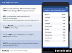Facebook сообщил, что удалил десятки страниц, связанных с российской «фабрикой троллей», которую в США обвиняют во вмешательстве в президентские выборы 2016 года. Накануне компания изъяла 70 учетных записей Facebook, 138 страниц Facebook и 65 учетных записей Instagram.
