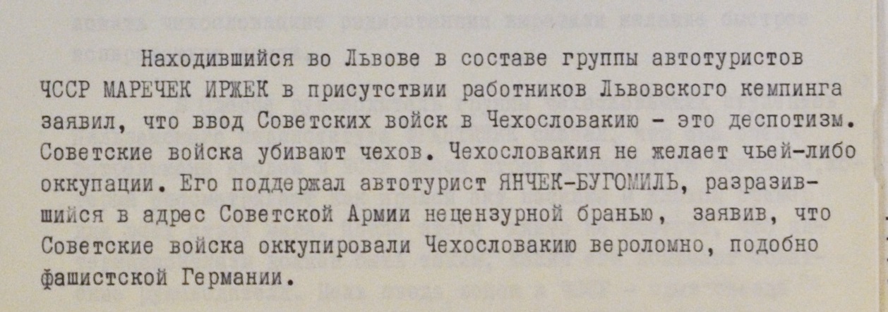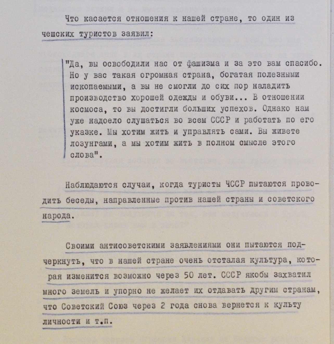 Перепиской “нежелательные” контакты граждан двух стран не ограничивались. КГБ отмечает, что летом 1968 года “значительно ухудшилось” поведение чехословацких туристов, приезжающих в СССР. Последние стали слишком часто говорить с местными о политике и позволять себе антисоветские выпады. При этом звучали куда более резкие выражения, чем в письмах. Например, один из туристов заявил: “Да, вы освободили нас от фашизма и за это вам спасибо. Но у вас такая огромная страна, богатая полезными ископаемыми, а вы не смогли до сих пор наладить производство хорошей одежды и обуви… В отношении космоса, то вы достигли больших успехов. Однако нам уже надоело слушать во всем СССР и работать по его указке”.