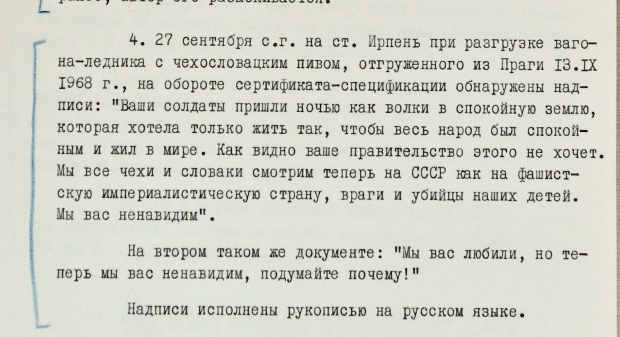В сентябре-октябре поток писем чехословацких детей советским принял еще более массовый характер. “В них обязательно утверждается, что чехи и словаки до 21 августа 1968 года относились к советским людям как к братьям, что в 1945 году воины СССР освободили Чехословакию, а их сыновья в 1968 оккупировали эту страну, что советские танки якобы разрушили чехословацкий Национальный музей1, давили гусеницами женщин и детей, а также содержатся другие клеветнические измышления”, – резюмировали чекисты.