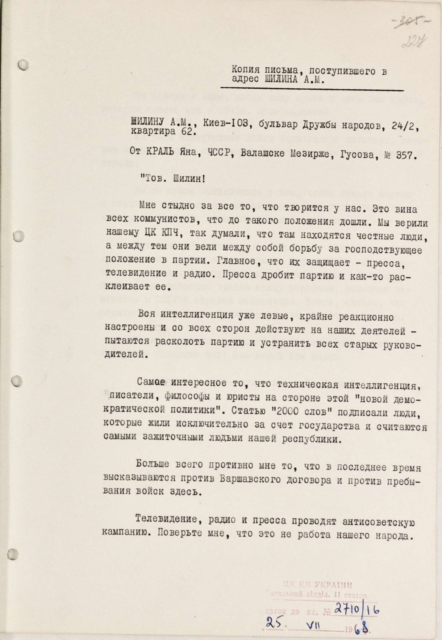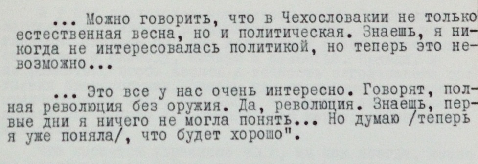 Если на ранних этапах Пражской весны в поле зрения чекистов попадали обычные письма друзьям и родственникам, то позже, летом, характер отбираемой корреспонденции меняется. Теперь чехословацкие граждане часто пишут в СССР с четкой целью: убедить, что происходящее у них – не контрреволюция, что никто не хочет отказываться от социализма и рвать отношения с восточным соседом. Видимо, люди верили, что это как-то спасет страну от военного вторжения.