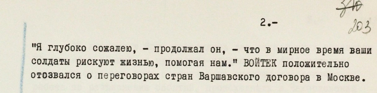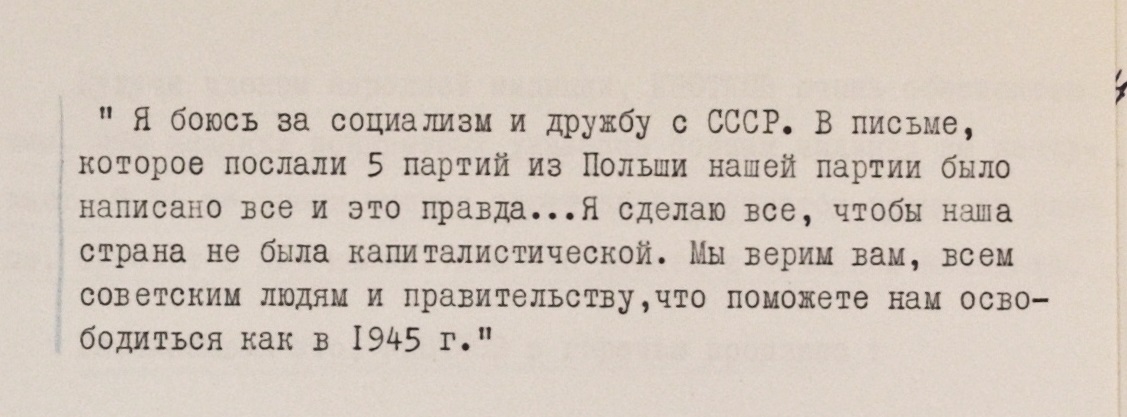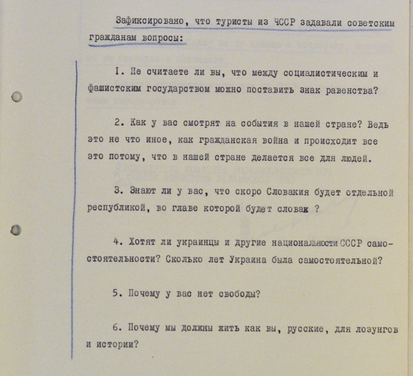 Комитет госбезопасности приводит список “крамольных” вопросов, которые гости из соседней страны задавали советским людям. Среди них, например, такой: “Почему мы должны жить как вы, русские, для лозунгов и истории?”