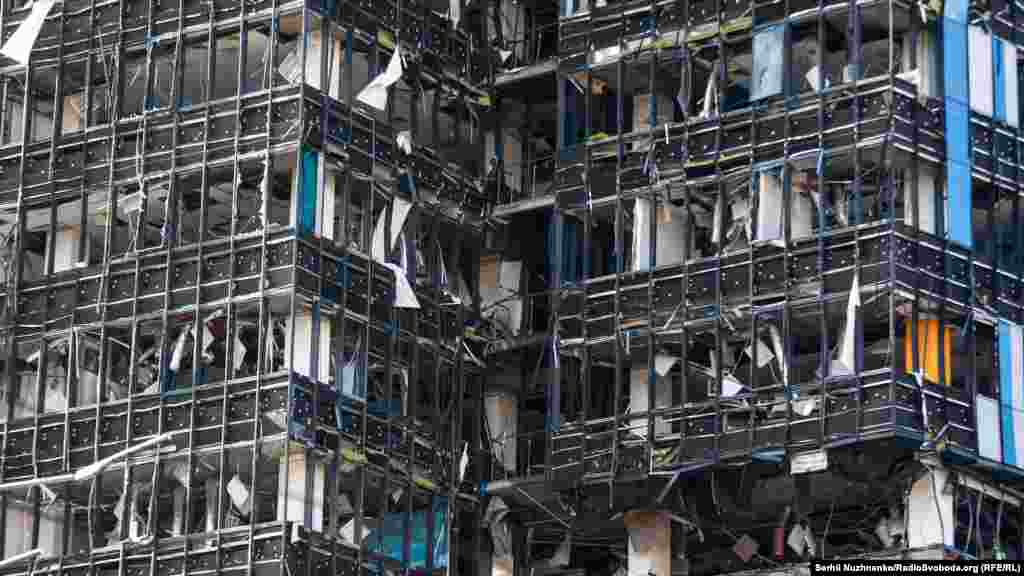 Здание одного из столичных бизнес-центров, который также получил повреждения в результате попадания российской ракеты. Киев, 10 октября 2022 года