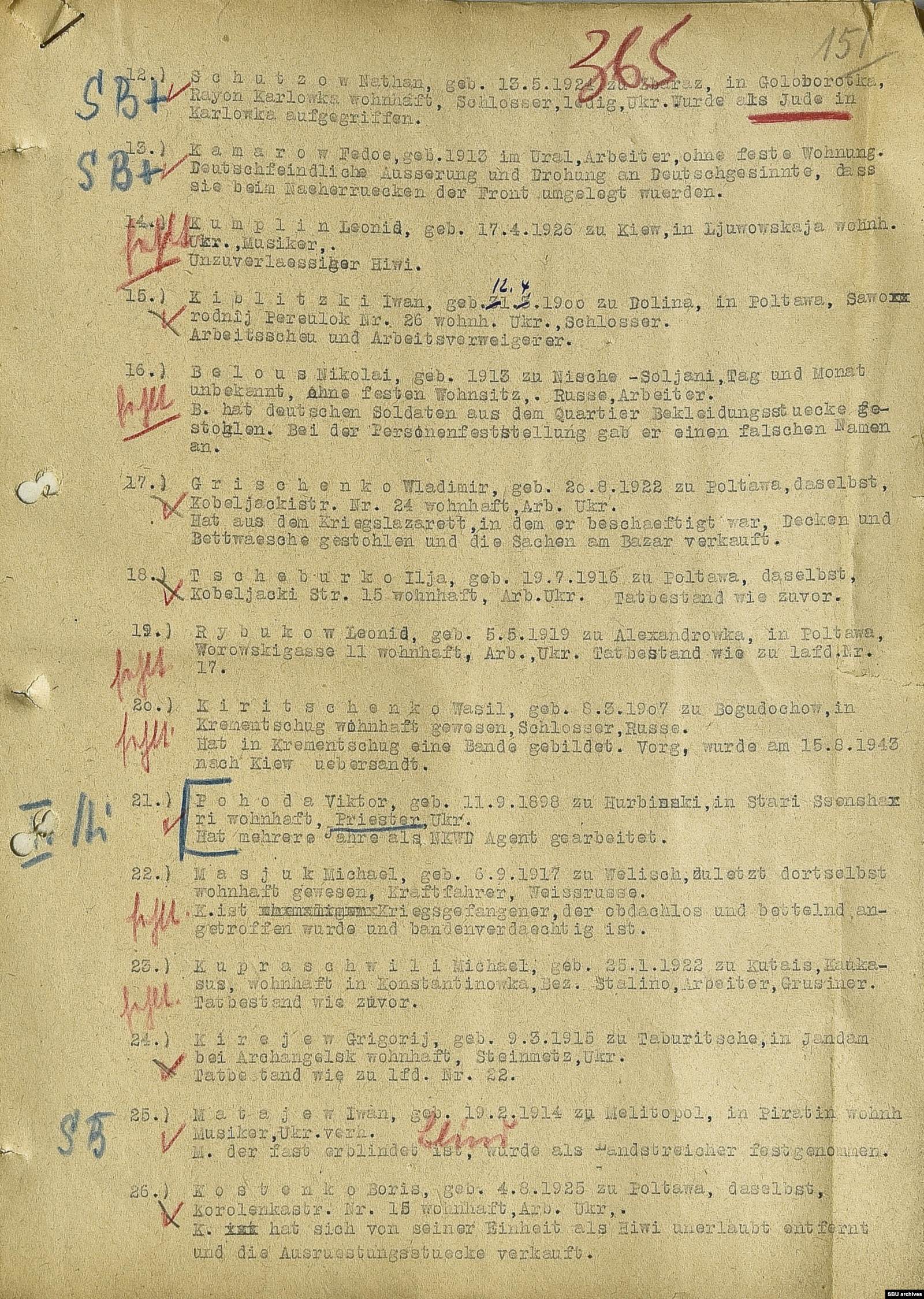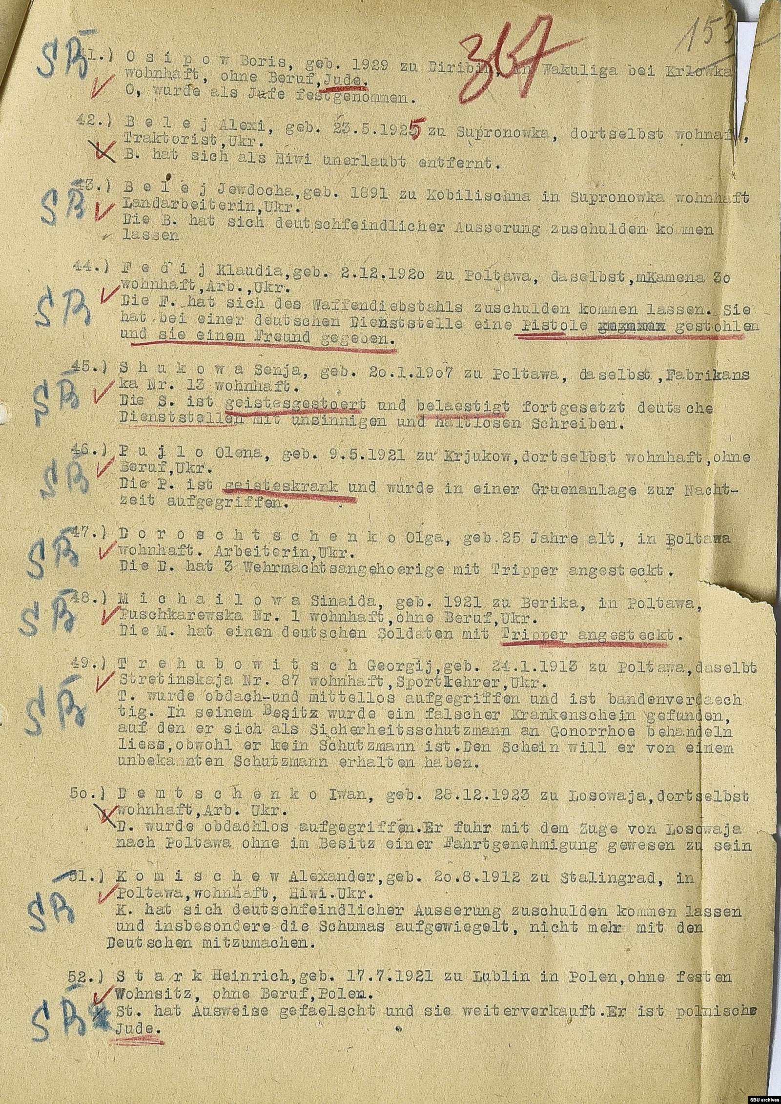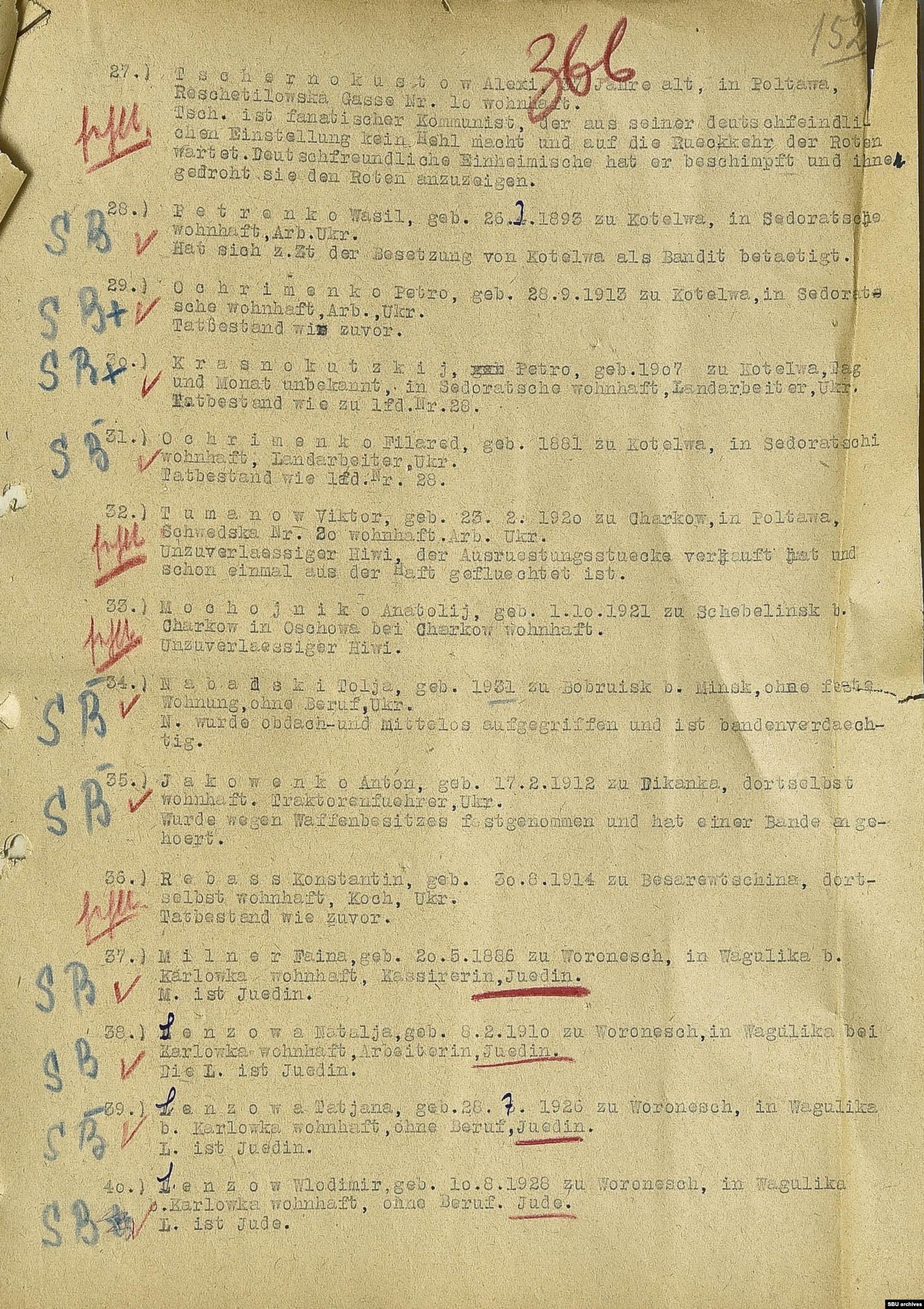 Возле большинства фамилий стоят надписи синим карандашом "SB" (Sonderbehandlung), что означает "особое обращение", то есть расстрел. И только несколько человек обозначены буквами "DHL", что означает направление в Сырецкий лагерь. Среди людей, которых росчерком синего карандаша лишили жизни и расстреляли в Бабьем Яре, – семья евреев, женщина с ментальными расстройствами, советские военнопленные, бродячий слепой музыкант, коммунист, священник – "агент НКВД", беглецы с принудительных работ и другие.
