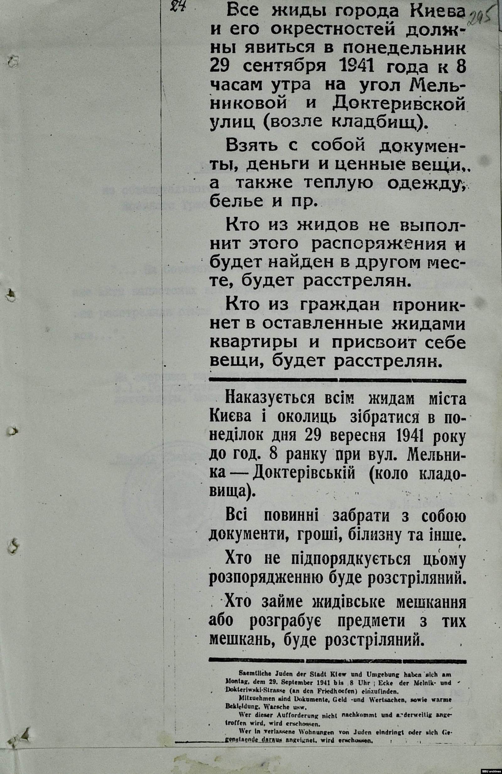 28 сентября по Киеву распространялся приказ: всему еврейскому населению города и окрестностей собраться на окраине возле кладбищ. С собой нужно было взять документы, деньги, вещи и прочее, поэтому многие люди не догадывались о том, что их ожидает. Большинство думали, что речь идет о переселении в другое место.
